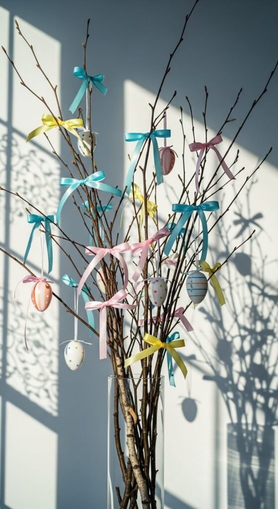 Collect interesting branches from your yard—birch, pussy willow, or even dried curly willow work great. Tie pastel ribbons and hang lightweight foam or plastic eggs from them. Place in a tall vase with stones at the bottom for weight.