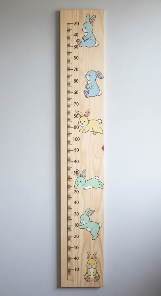 Track height with a bunny-decorated growth chart. Paint bunnies along a wooden ruler or canvas strip. Mark measurements clearly.
