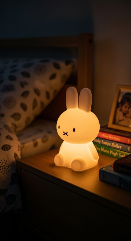 A bunny-shaped night light provides comfort at bedtime. Look for LED options that stay cool. Some change colors slowly.