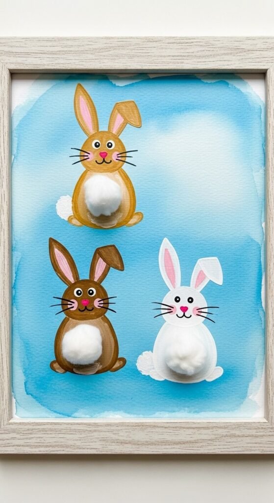 Create artwork using cotton balls for bunny tails. Paint bunny bodies on canvas or cardboard. Glue cotton balls where tails belong.