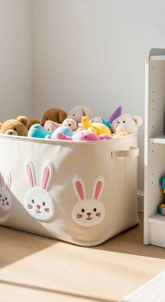 Store toys in bunny-decorated fabric bins. Find canvas bins with bunny prints or appliqués. Collapsible ones save space when empty.