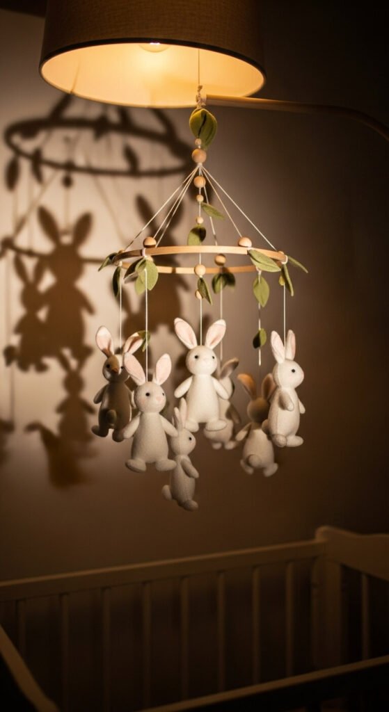 Hang a bunny mobile above a crib or reading corner. Felt or paper bunnies dangle from strings. They rotate gently in air currents.
