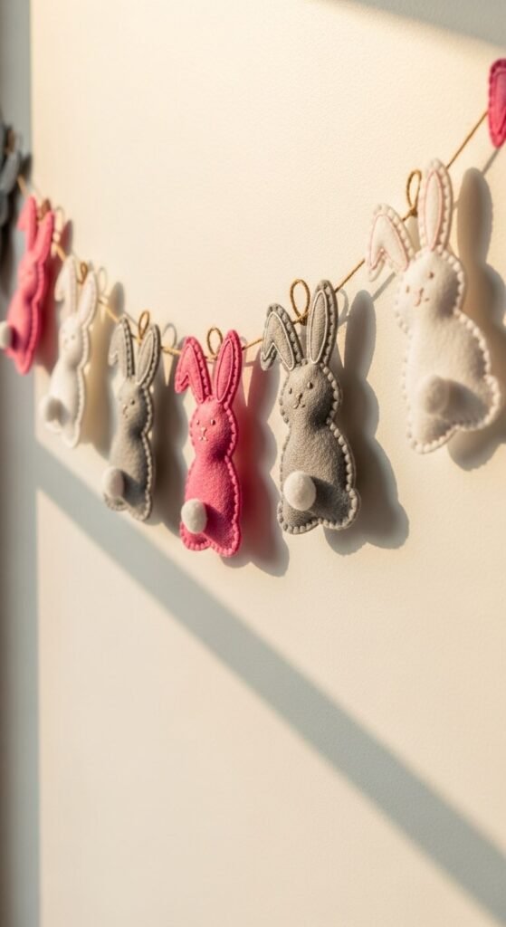 String together felt bunnies for instant wall charm. Cut bunny shapes from felt sheets in different colors. Use a hot glue gun to attach them to twine or ribbon.