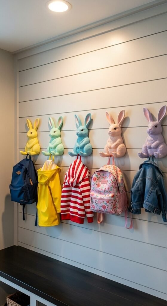 Mount bunny-shaped hooks for coats and bags. Ceramic or wooden bunny hooks come in many colors. Install them at kid height.