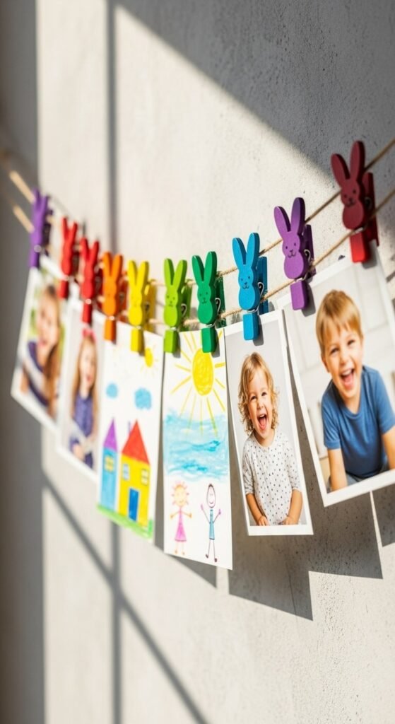 Clothespin sets cost $6-10. Kids can change displayed items themselves. This rotating gallery celebrates their creativity. Paint plain wooden clips to match room colors.