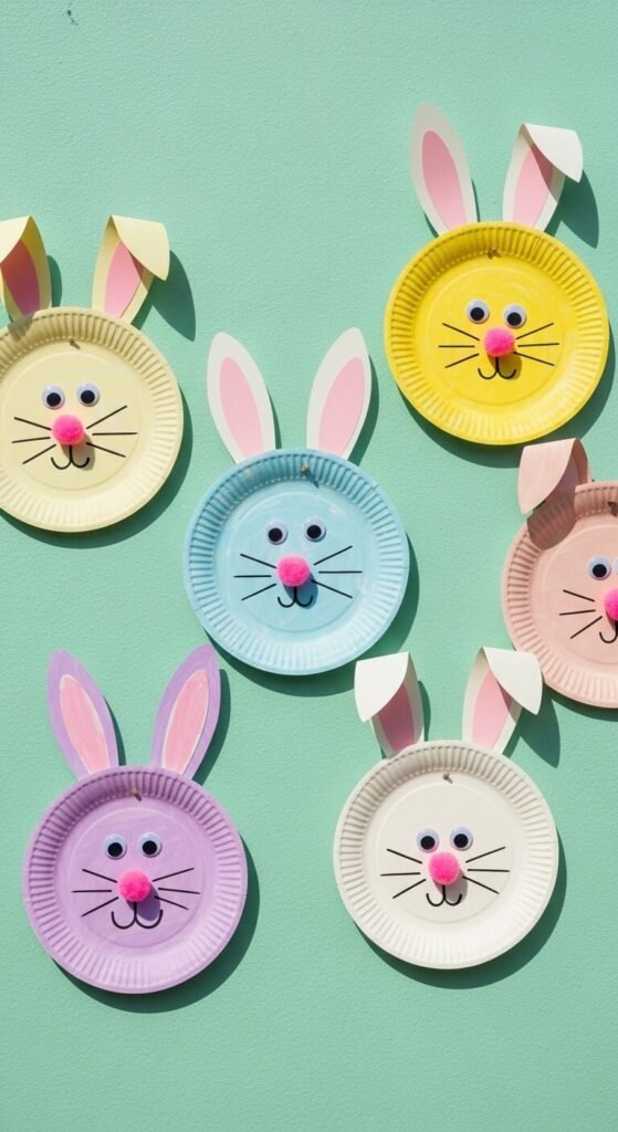 Paint paper plates in pastel colors for bunny faces. Add construction paper ears, googly eyes, and a pompom nose. Draw whiskers with markers.