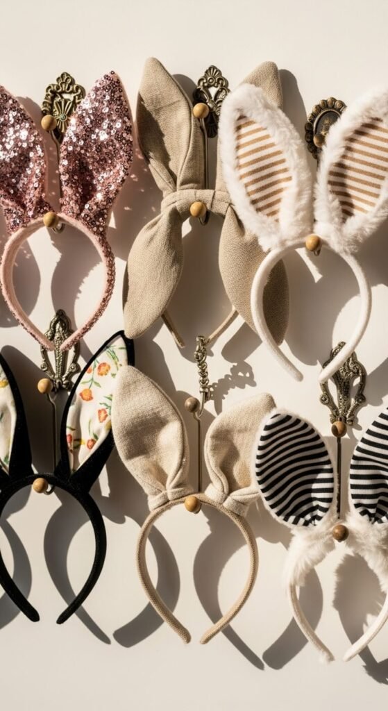 Hang bunny ear headbands as wall art between wearings. Mount decorative hooks at kid height. Display different styles and colors.