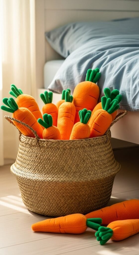 Plush carrots cost $3-8 each. Kids can toss them, stack them, or use them for pretend play. The basket keeps everything tidy.