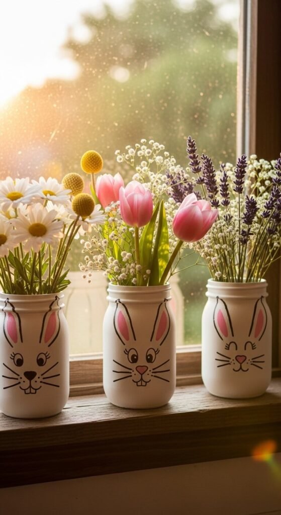 Paint mason jars white and add bunny faces. Use black permanent marker for features. Fill with fresh or fake flowers.