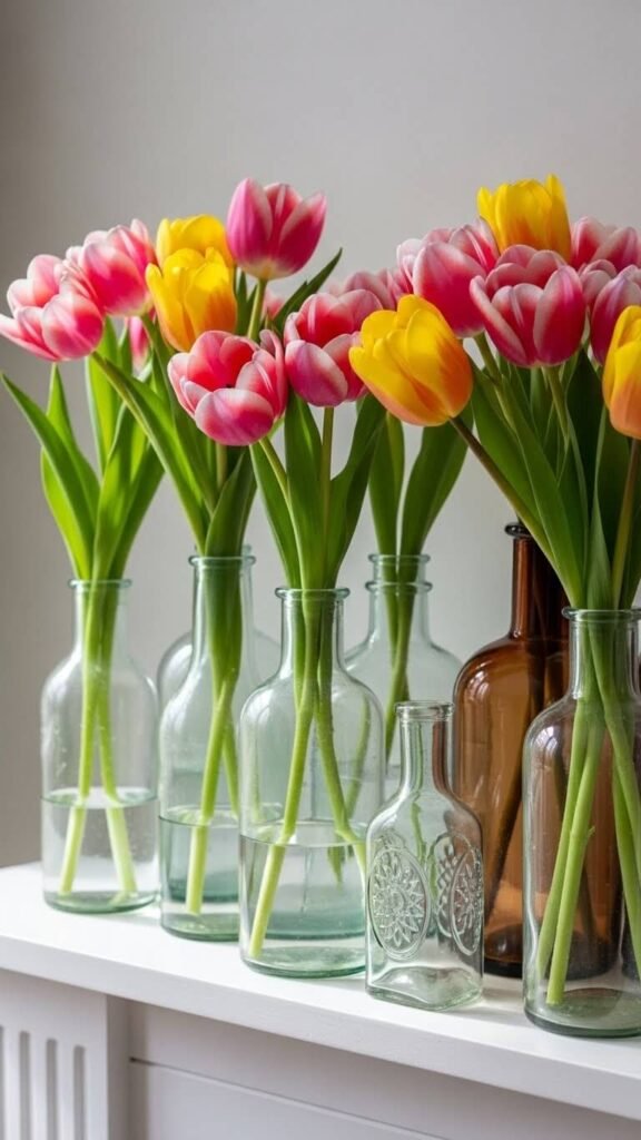 Gather old bottles from thrift stores or your pantry. Fill them with grocery store tulips in soft colors like blush, butter yellow, or lavender. Group three to five bottles together for balance. This look costs under $15 and takes five minutes to assemble. Change the water every few days to keep blooms fresh. The mix of bottle heights adds visual interest without feeling cluttered. Perfect for renters or anyone wanting a simple, changeable display.