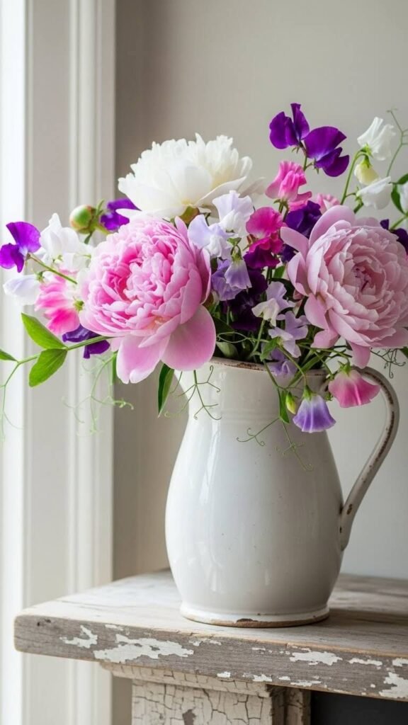 Use a vintage ceramic pitcher instead of a traditional vase. The handle and spout add farmhouse character. Thrift stores have these for $4-$8. Fill with grocery store flowers or cuttings from your yard. The wider opening makes arranging easier for beginners. Pitchers work well with loose, natural-looking bunches rather than formal arrangements. Rotate between white, cream, or pastel glazes to match your mood.