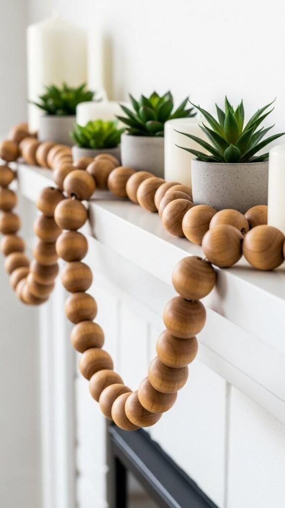 Drape a wooden bead garland across your mantel for subtle texture. These run $10-$15 online and add a Scandinavian minimalist vibe. The neutral tone works with any color scheme. Layer it behind other items for depth. You can make your own by stringing craft beads on thick twine. The natural material brings warmth without adding color. Works perfectly with modern or farmhouse styles.