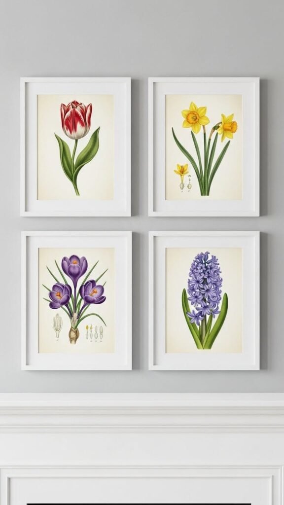 Print botanical illustrations from free online archives and frame them in matching frames. Dollar stores sell basic frames for $1-$3 each. Arrange four to six prints symmetrically above your mantel. This adds art without breaking your budget. Choose spring flowers like lilacs, cherry blossoms, or tulips. The symmetry creates calm and order. Change prints with the seasons by keeping the frames.