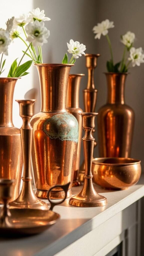 Mix in copper items like vases, candlesticks, or small bowls. The warm metal adds sophistication and reflects light beautifully. Thrift stores often have tarnished copper pieces for $3-$10. A quick polish makes them shine, or leave the patina for vintage charm. Copper works with both modern and traditional spaces. Pair with white or green for a classic spring look. Three copper pieces create cohesion without overwhelming.