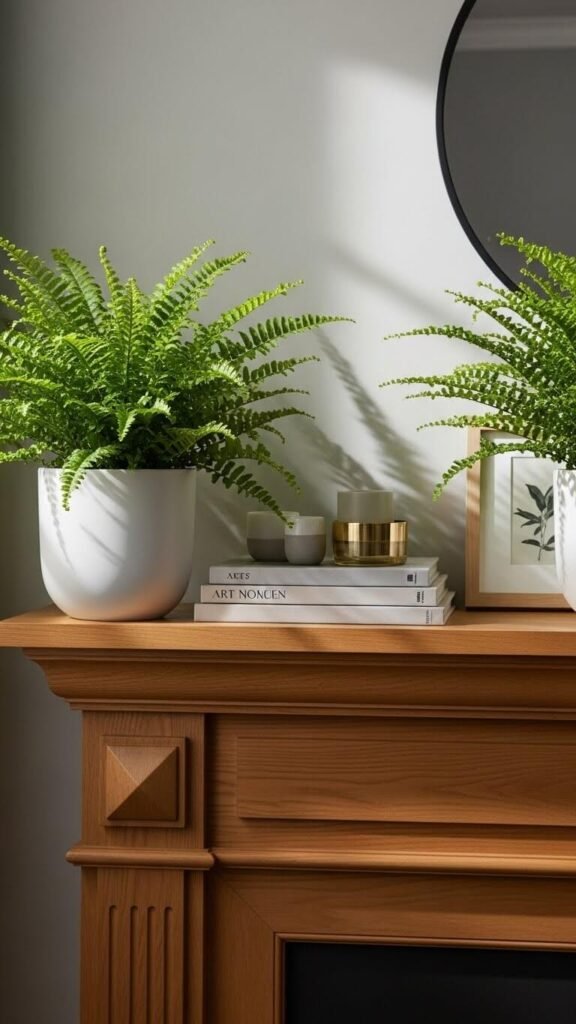 Place potted ferns on each end of your mantel as bookends. These $8-$12 plants bring life and symmetry. Ferns thrive indoors with weekly watering. The delicate fronds soften hard mantel edges. White or terracotta pots work equally well. This creates a finished, grounded look. Ferns last for months with basic care. Rotate them weekly so all sides get light.