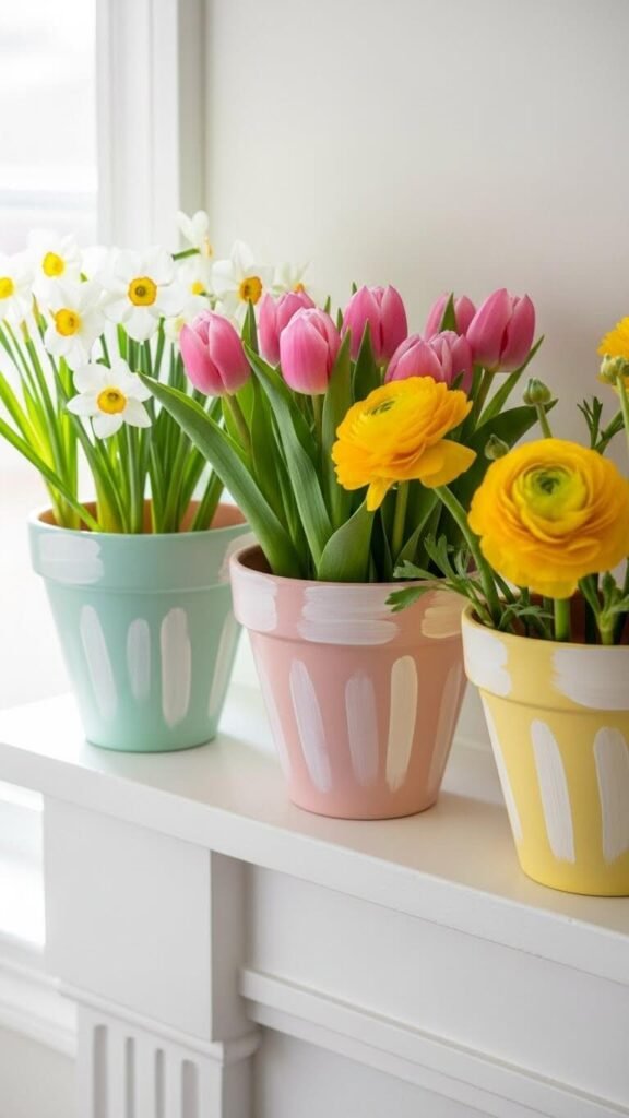 Buy basic terra cotta pots for $1-$2 each and paint them in spring pastels. Use acrylic craft paint for easy cleanup. Plant real flowers or use them as vases. The handmade quality adds personality. Let kids help paint for family involvement. Line pots with plastic if using as vases. The color brings joy without expensive materials. Repaint seasonally to stay current.