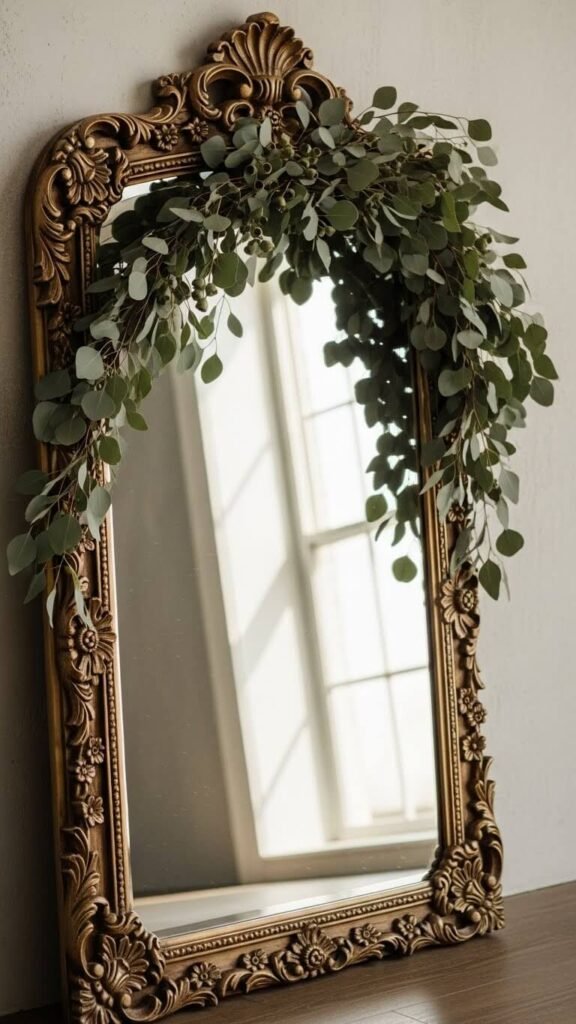 Lean a mirror behind your mantel items instead of hanging it. Drape real or faux eucalyptus across the top edge, letting it cascade down the sides. This creates depth and makes your space feel larger. Mirrors from discount stores work perfectly. The greenery softens hard edges and brings life to the arrangement. Secure branches with clear fishing line if needed. This trick works year-round by simply swapping the greenery type.