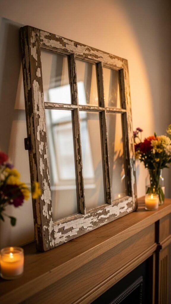 Lean an old window frame behind your mantel items for architectural interest. Salvage yards sell these for $10-$25. The panes reflect light and add depth. Paint it to match your walls or leave it distressed. This works especially well on deep mantels. The vintage character tells a story. The vertical lines draw eyes upward, making ceilings feel higher. No installation required—just lean and style around it.