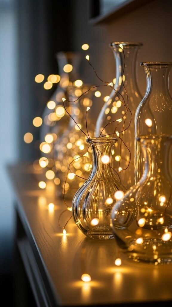 String battery-operated fairy lights behind your mantel display for gentle ambiance. These cost $8-$15 and create warmth in the evening. Copper wire styles bend easily around objects. The soft glow highlights glass and metallic items beautifully. No outlet needed with battery power. Kids love the magical effect. Turn them on before guests arrive for instant atmosphere. The warm light makes everything feel more welcoming.