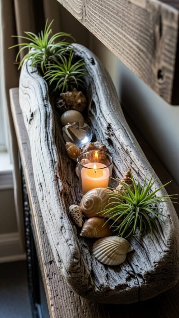 Find driftwood at beaches or buy sanitized pieces at craft stores for $10-$20. Use it as a horizontal base for candles, shells, or small plants. The organic shape brings nature indoors. Each piece is unique and full of character. The neutral gray-brown tone works year-round. Tuck air plants into natural hollows for living accents. This coastal-casual vibe suits any home style.