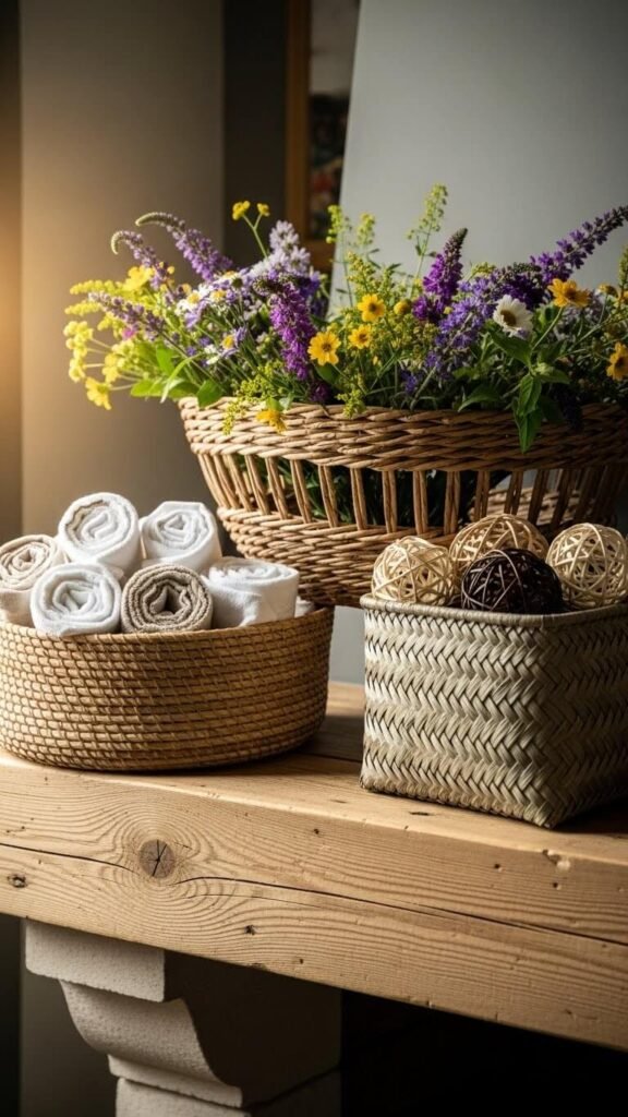 Group three baskets in different sizes and weave patterns. Fill them with flowers, linens, or decorative balls. Thrift stores have baskets for $2-$6 each. The natural texture adds warmth and grounds other elements. Woven materials bring handmade quality without actual crafting. Stack or cluster them for impact. The neutral tones work with any color palette. This feels collected and personal rather than store-bought.