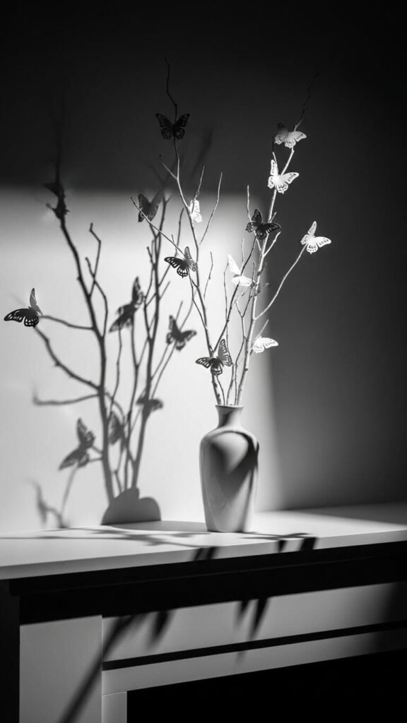 [Image Prompt: Tall bare branches painted white standing in a ceramic vase, with small paper butterflies attached to the tips. Clean white mantel background with soft side lighting creating dramatic shadows. Professional camera emphasizes the sculptural quality and delicate paper details.]