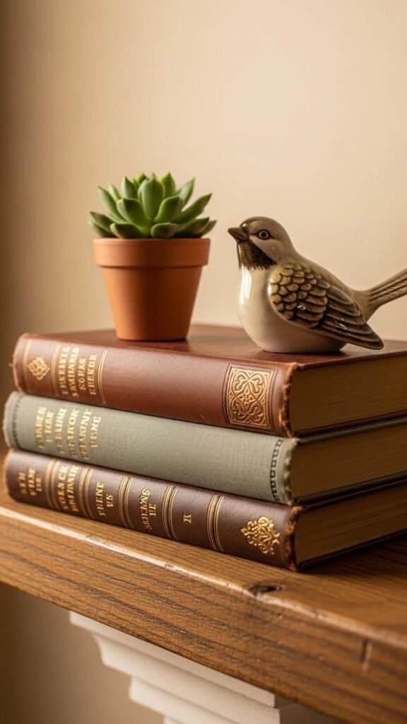 Stack three to five old books horizontally as platforms for other decor. Library sales and thrift stores sell these for $1 each. Place candles, small plants, or figurines on top of the stacks. The varied heights create visual rhythm. Choose books with pretty spine colors that match your room. This trick adds personality and tells a story. Rotate books seasonally to keep things fresh.