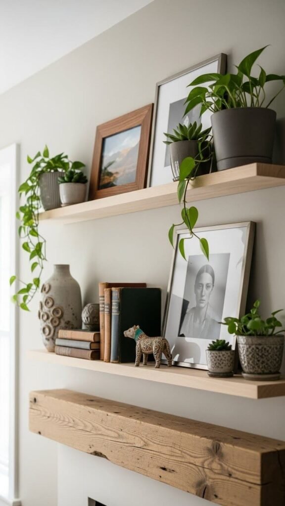 Install a thin floating shelf above your mantel to add display space. This doubles your decorating area without blocking the fireplace. Home improvement stores sell easy-install shelves for $15-$25. Stagger items at different heights between the two levels. Small plants, photos, or collected objects work well. This solves the problem of narrow mantels. Paint the shelf to match your wall for a seamless look.