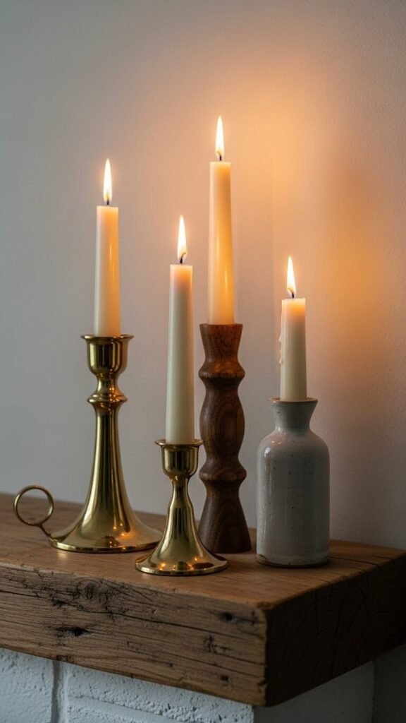 Find three candlesticks in different heights at thrift stores for $3-$7 total. Mix materials like brass, wood, or ceramic for texture. Place them off-center in a triangular arrangement. Use unscented candles if you have allergies. The varying heights create movement and guide the eye across your display. Group them on one side and balance with a larger item on the other. Battery candles work great if you have kids or pets.