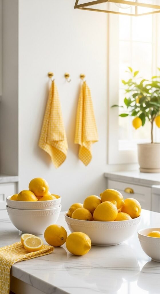 Tile accents make big impacts. Install a small section of lemon-patterned tiles behind your stove or sink. Peel-and-stick versions require zero grout and come off cleanly. They start at $1 per tile. Mix solid yellow tiles with white for a checkerboard effect if hand-painted feels too busy. This weekend project changes your kitchen’s entire personality. Watch online tutorials for installation tips. The pattern catches light beautifully and wipes clean easily after cooking.