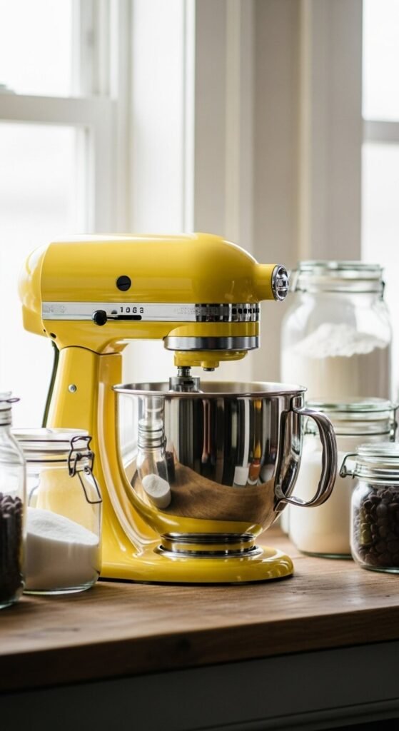 Your mixer sits out anyway—make it beautiful. Yellow stand mixers from brands like KitchenAid become instant focal points. They’re pricey new, but refurbished models or holiday sales bring prices down. The appliance combines function with decor, earning its counter space. If you already own a mixer, some brands sell colored shell replacements. This investment piece lasts decades while making baking more enjoyable. The cheerful color motivates you to use it more often.