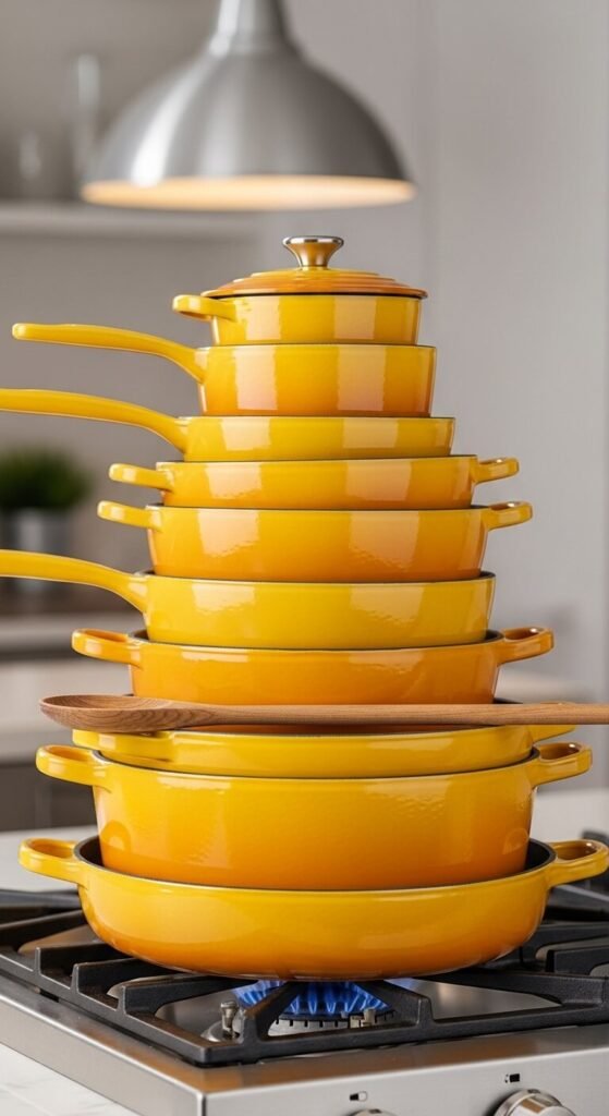 Cookware does double duty as decor. Le Creuset and similar brands offer gorgeous yellow options. Hang pots from a ceiling rack or display on open shelving. The enamel finish cleans easily and distributes heat well. Buy one piece at a time to spread the cost. Even a single yellow Dutch oven makes a statement. The saturated color photographs beautifully if you share cooking content online. Quality pieces last for generations.