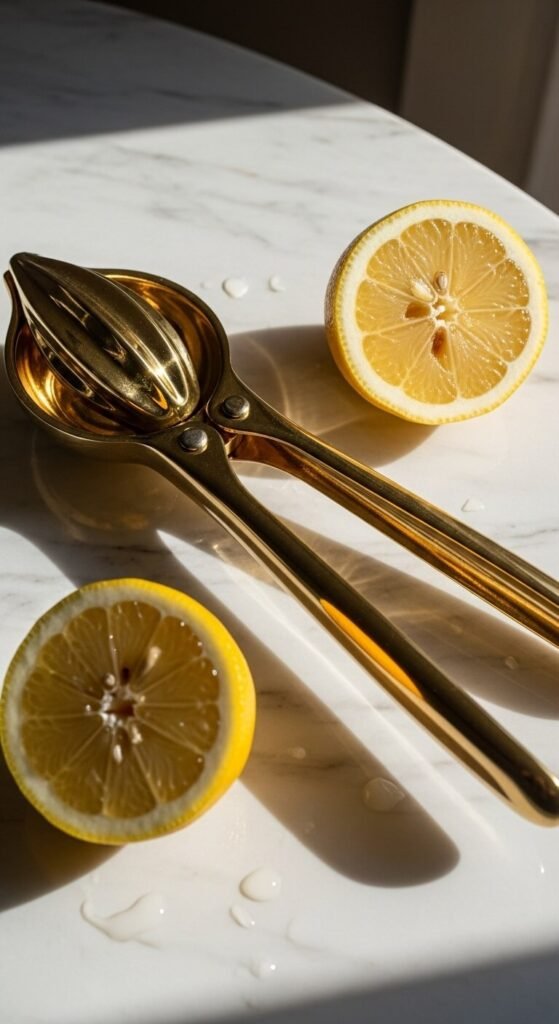 A quality brass squeezer ages beautifully. The metal develops a warm patina that adds character. Keep it out on a small tray near your sink or stove. It’s ready when you need it and gorgeous when you don’t. Expect to pay $15 to $30. The weight feels substantial in your hand. Rinse after each use and dry immediately. The golden tone complements yellow accents while adding a sophisticated touch.