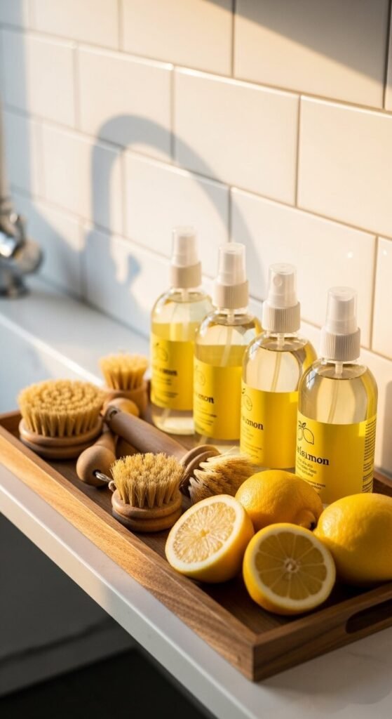 Organize cleaners in a pretty tray. Use glass bottles with lemon essential oil cleaners for counters and surfaces. Add fresh lemon halves for scrubbing and deodorizing. The citrus scent is powerful and natural. Make your own cleaner with vinegar, water, and lemon juice for pennies. Label bottles with a chalk marker. The tray contains everything in one spot while looking intentional. Refill bottles from bulk supplies to save money long-term.