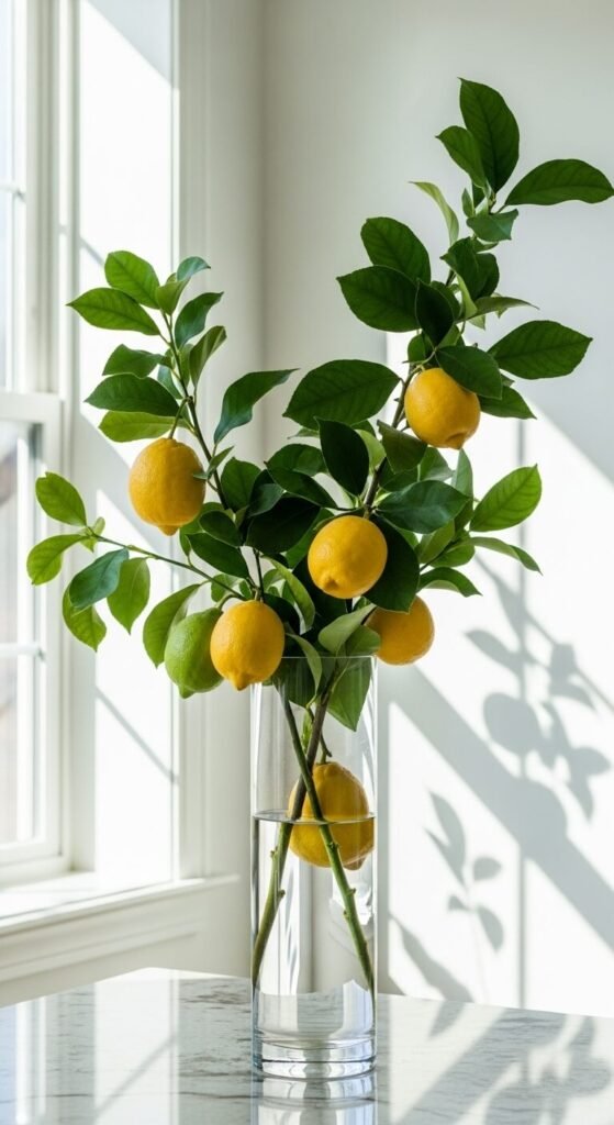 Bring nature inside with lemon branches. Grocery stores sometimes sell them, or ask your local florist. Place branches in a clear vase to show stems and water. They last one to two weeks and smell wonderful. The sculptural quality adds elegance. Change water every few days. When lemons start to soften, compost them and start fresh. This living arrangement beats fake flowers and costs less than $10 per bundle.