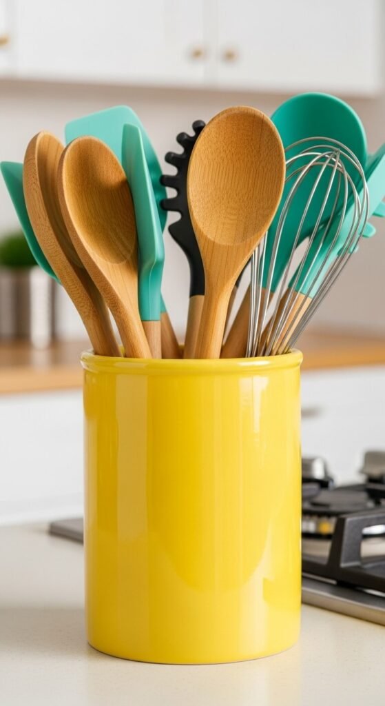 Corral your cooking tools in style. A bright yellow crock keeps spatulas and spoons handy while adding color. Ceramic versions are heavy enough not to tip. Look for ones about six inches tall and wide. Fill with your most-used tools—wooden spoons, silicone spatulas, tongs. This runs $10 to $20 and eliminates drawer digging. The vertical element adds height variation to your counter landscape. Choose solid colors over patterns for maximum impact.