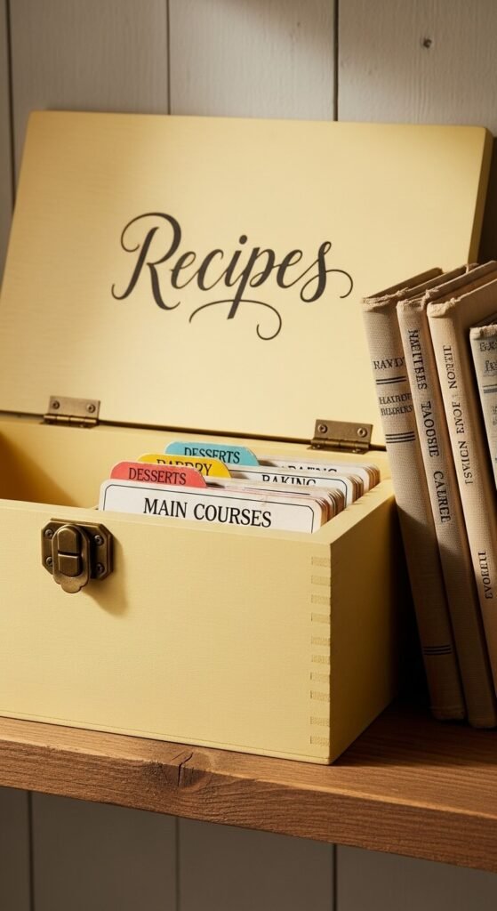 Store recipes in a beautiful box. Paint a wooden box yellow or find one already decorated with lemons. Organize cards by category with labeled dividers. This keeps family recipes safe and accessible. Thrift stores sell empty boxes for a few dollars. The act of flipping through cards feels more personal than scrolling a phone. Display it on your counter or shelf. Add new recipes as you discover them, building your collection over time.