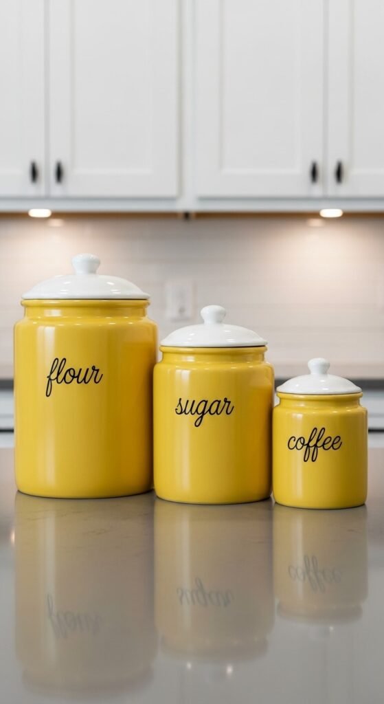 Bright yellow canisters organize your staples with style. Look for sets that hold flour, sugar, and coffee. Ceramic or enamel versions last longer than plastic. They create a cohesive look on open shelving or counters. If buying new feels too expensive, spray paint your existing canisters. Use painter’s tape for clean lines. Add simple labels with a black marker. These become a focal point while keeping ingredients fresh and easy to grab.