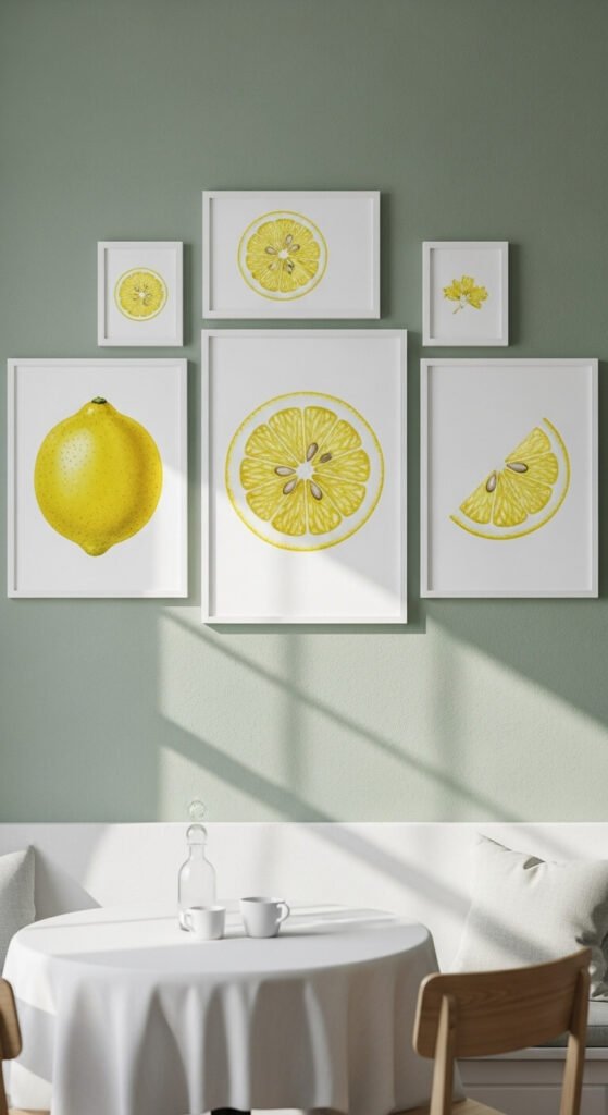 Create gallery walls with lemon art. Print free watercolor designs from online sources or paint your own. Frame them in matching white frames from dollar stores. Arrange three to five prints above your breakfast nook or near the pantry. This costs under $20 total. You can also frame vintage lemon crate labels found on Etsy. The vertical arrangement draws eyes upward, making small kitchens feel bigger. Change prints seasonally if you like switching things up.