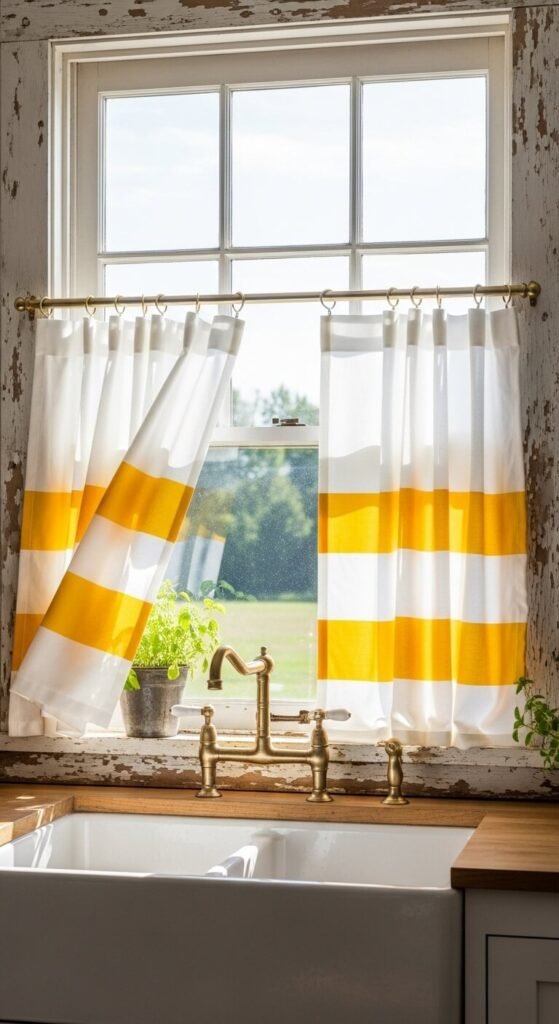 Window treatments set the mood. Choose curtains with lemon yellow stripes or subtle citrus prints. Café-style half curtains work great over the sink. They let light in while adding privacy. Measure your window and hem if needed—no sewing machine required. Use fabric glue or iron-on tape. Target and IKEA carry affordable options under $25. The pattern adds movement and softness. Pair with neutral walls so the curtains become the star.