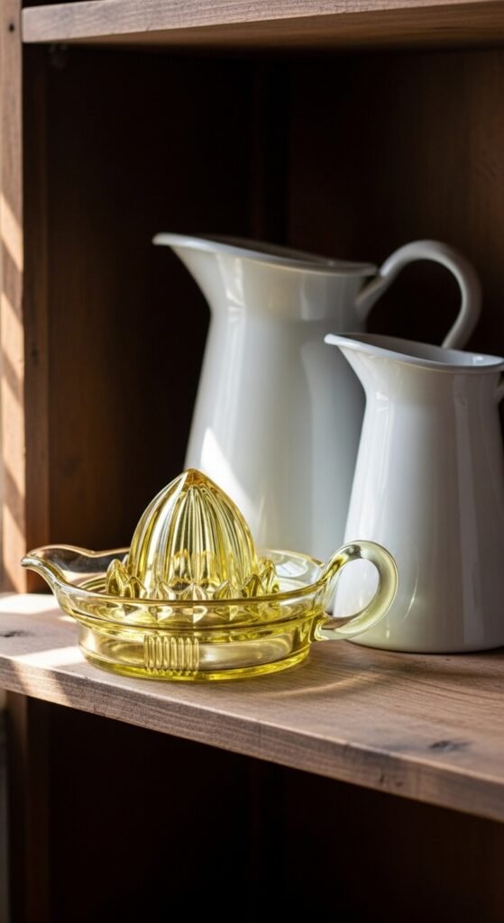 Old lemon juicers make charming decor. Hunt flea markets for glass or ceramic versions from the ’50s and ’60s. Display them on open shelves or windowsills. They cost $5 to $15 and actually work when you need fresh juice. The vintage design adds character modern pieces can’t match. Group three together in different colors or styles. Clean them gently with warm soapy water. These conversation starters blend function with nostalgic appeal.
