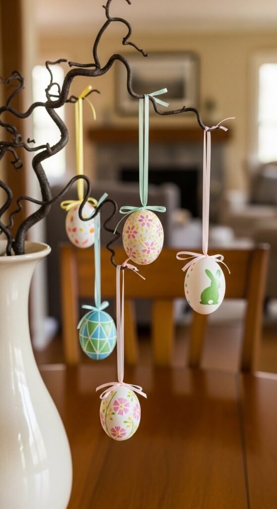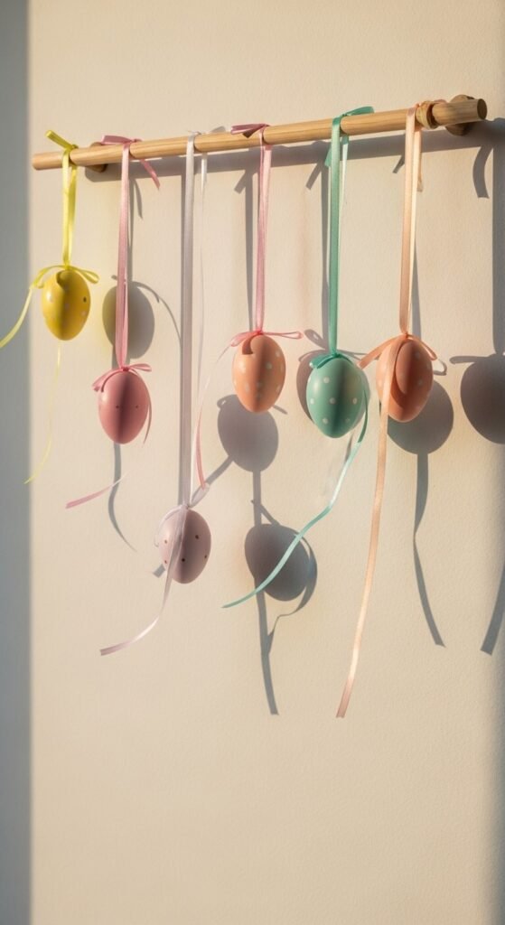 Mount a wooden dowel or curtain rod on a wall and hang eggs from it at varying lengths using ribbon or twine. Pierce the top of each egg with a pin or skewer, loop through a length of ribbon, and tie it to the rod. Stagger the heights so the eggs cascade down the wall unevenly. This turns a blank wall into a seasonal art installation for practically nothing. It’s great in a dining room, hallway, or above a sofa.