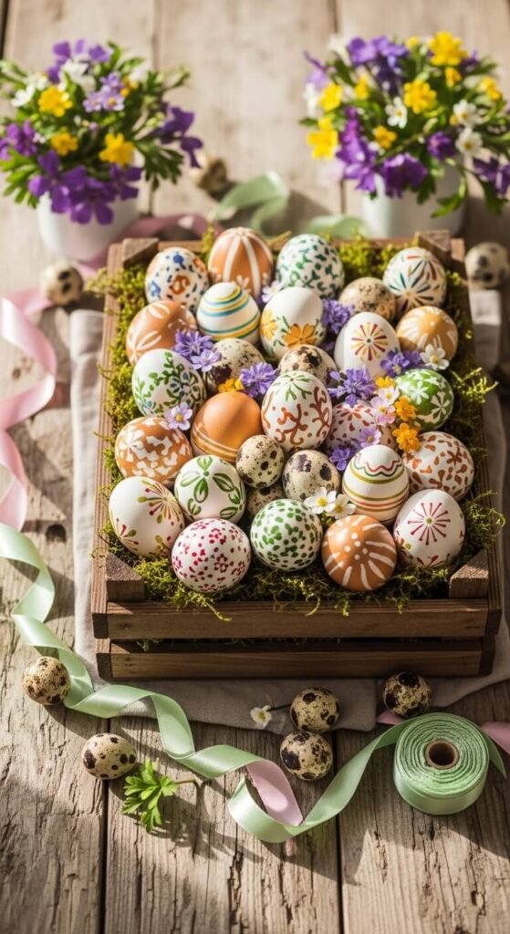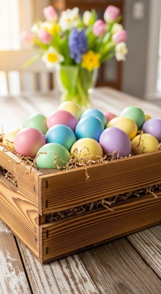 A worn wooden crate gives any egg display a farmhouse feel. Line the inside with shredded kraft paper or green Easter grass to keep eggs from rolling. Stack eggs loosely so they look casually tossed in — not perfectly arranged. Crates are easy to find at craft stores, flea markets, or even repurposed from wine shops. This is one of those displays that looks great with minimal effort and works on a porch, table, or shelf.