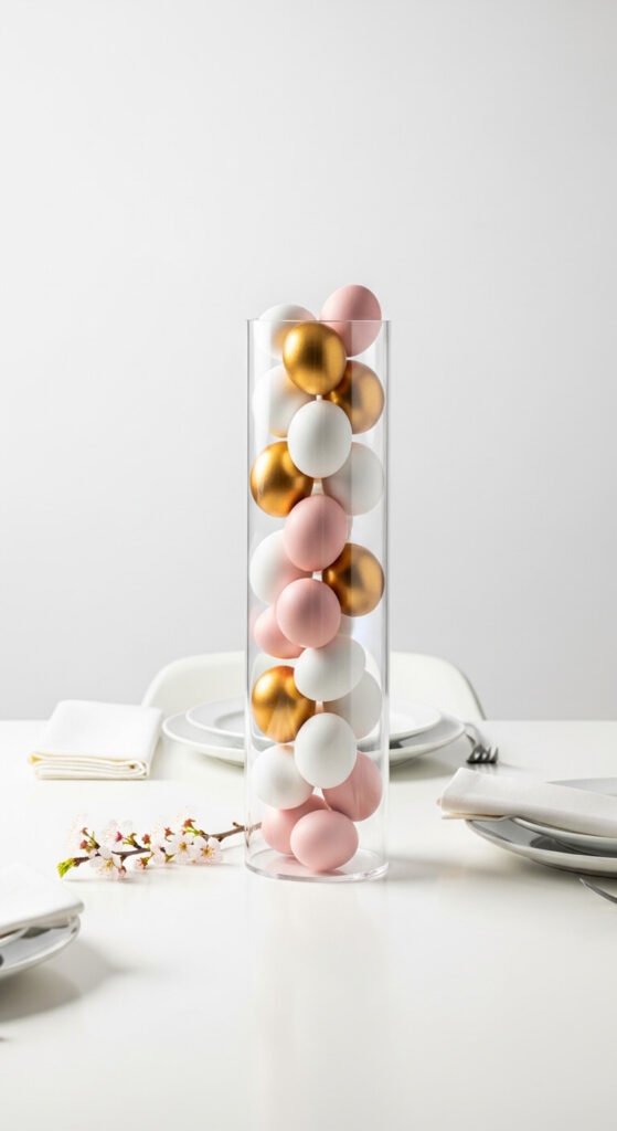 Stack eggs inside a tall clear cylinder vase for a modern, minimalist display. Alternate colors or finishes as you stack — white, gold, blush, repeat — for a pattern that reads beautifully from across the room. Use a mix of real and plastic eggs so the bottom layer handles the weight. This works especially well on a dining table or reception counter. It’s sleek, simple, and looks far more expensive than it actually is.