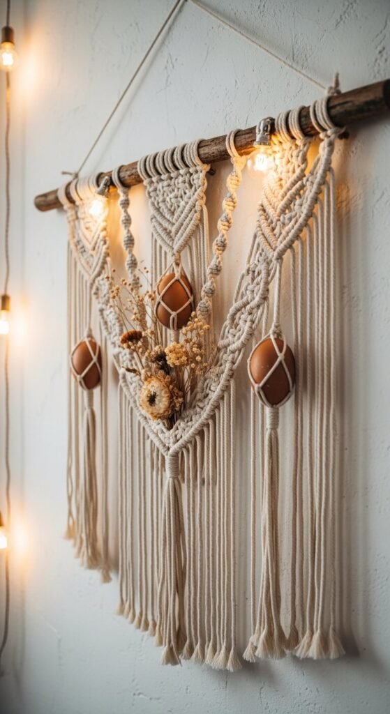 If you’re into boho or natural home décor, this one is for you. Weave small plastic Easter eggs into the knots of a macramé wall hanging or tie them on with thin string at varying heights. Stick to neutral egg tones — cream, tan, speckled — to keep the look organic. This display makes a stunning wall statement and feels fresh compared to traditional tabletop displays. You can buy an inexpensive macramé piece online and adapt it with eggs in about 20 minutes.