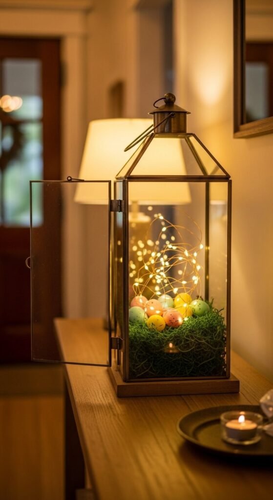 Glass lanterns are one of the most flexible seasonal décor pieces you can own. Place a layer of sheet moss at the bottom of the lantern, then arrange eggs on top. Add a strand of battery-operated fairy lights for a warm nighttime glow. This display works beautifully in a foyer, on a mantle, or as an outdoor porch accent. You can usually find lanterns at HomeGoods or Target for under $15, and the eggs do all the visual work inside.