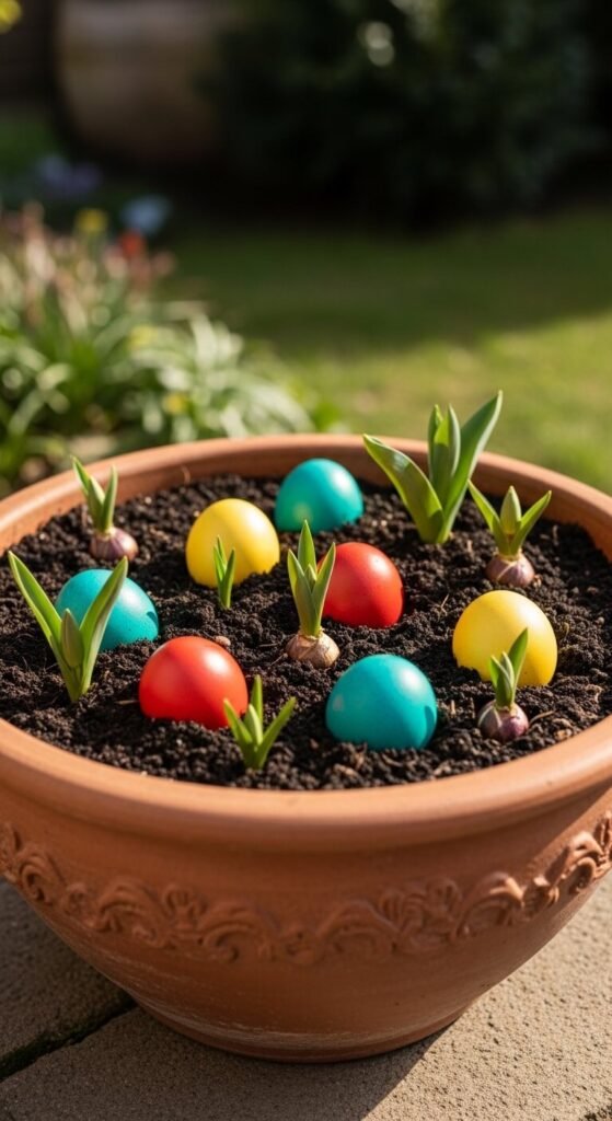 Take your display outside by hiding Easter eggs throughout a large planter or garden bed. Push plastic eggs halfway into the soil at different angles so they look like they’re naturally emerging. Mix in small planted flowers like pansies or tulips for a living display. It’s eye-catching, unexpected, and incredibly easy to do. Kids love it, and guests will do a double take when they spot it on your porch or front steps. Cost: zero, if you already have the planters.