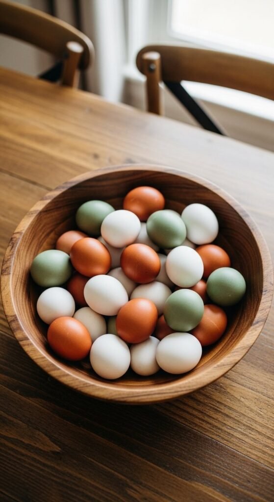 A large wooden bowl makes one of the simplest and most beautiful Easter egg displays. Fill it with eggs that follow a tight color palette — all earth tones, all pastels, or all white — for a look that feels curated rather than random. Wooden bowls are a staple in most homes already. This display costs nothing if you’re reusing what you have. It works on a dining table, kitchen island, or coffee table and feels warm, inviting, and completely put together.