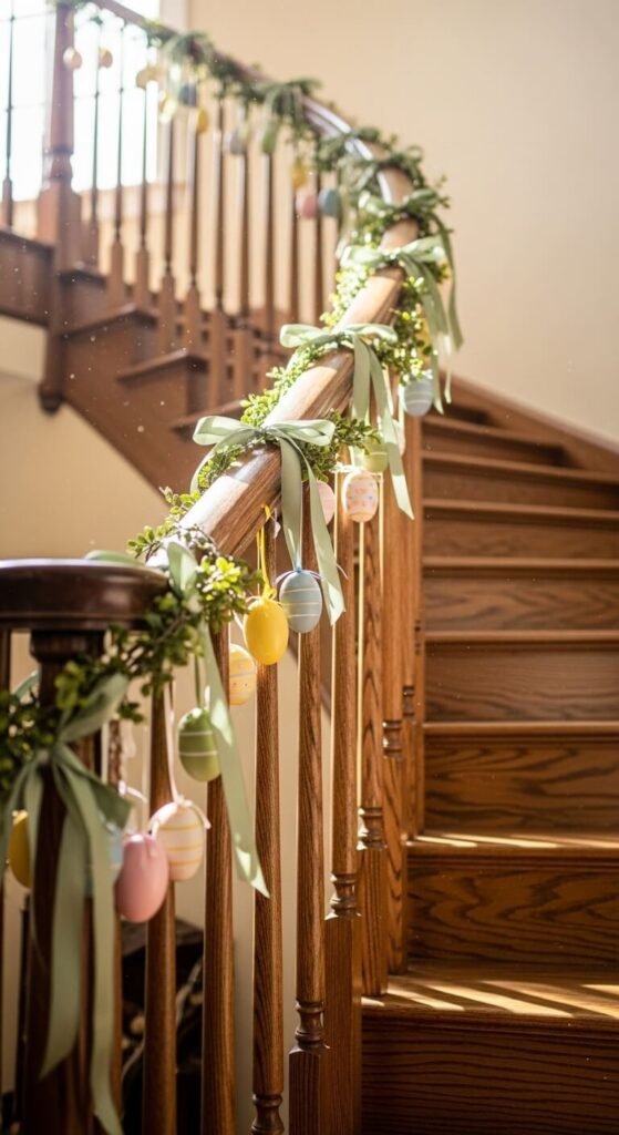Your staircase banister is a display zone you might be overlooking. Tie Easter eggs to the spindles or railing with ribbon bows at even intervals as you go up. Use one color family for a coordinated look or go full rainbow for a playful, festive feel. This display is visible from your entryway and sets an immediate Easter mood when guests walk in. It takes about 20 minutes and costs very little if you already have ribbon and eggs on hand.