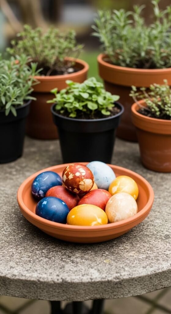 Terracotta saucers from the garden center cost almost nothing and make beautiful, natural display bases. Pile a handful of earth-toned eggs into the dish for an organic, unpretentious display that works indoors or outdoors. Try naturally dyed eggs in warm colors — rust, indigo, ochre — for a sophisticated look that doesn’t feel kitschy. Place it on a coffee table, patio table, or kitchen shelf. This is one of those displays that looks like you thought about it a lot, even though you didn’t.